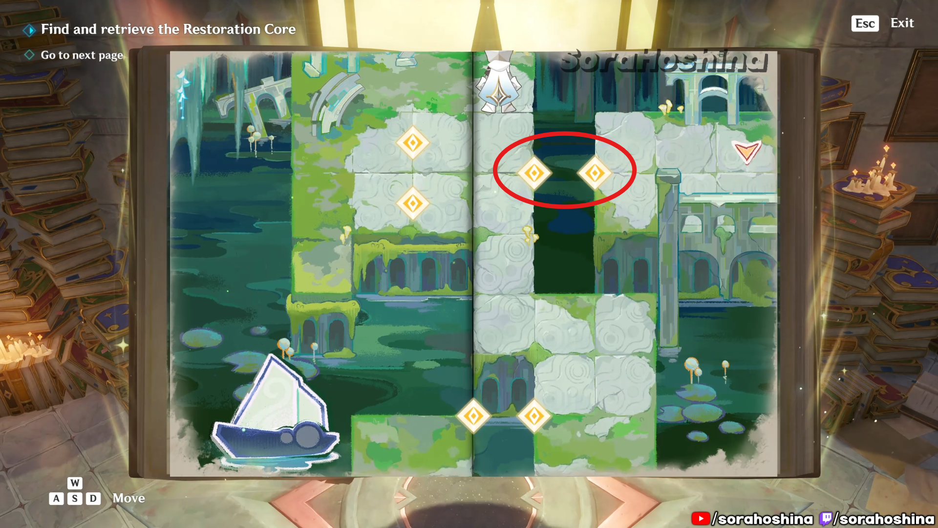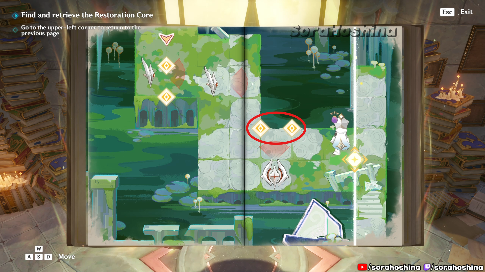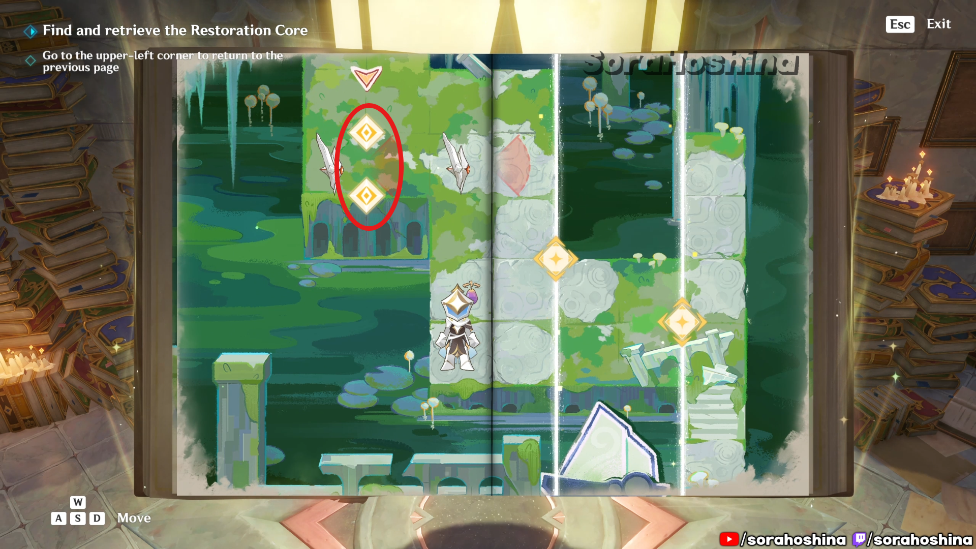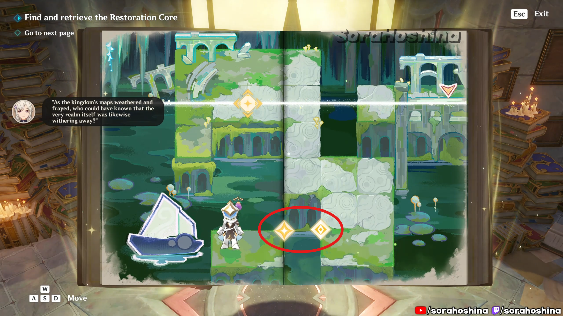 Inside the room with Fontain’s mechanism, flip the page in this room from right side only halfway to the left so you can get said mechanism. Unfortunately, it’s a trap to get the Restoration Core.