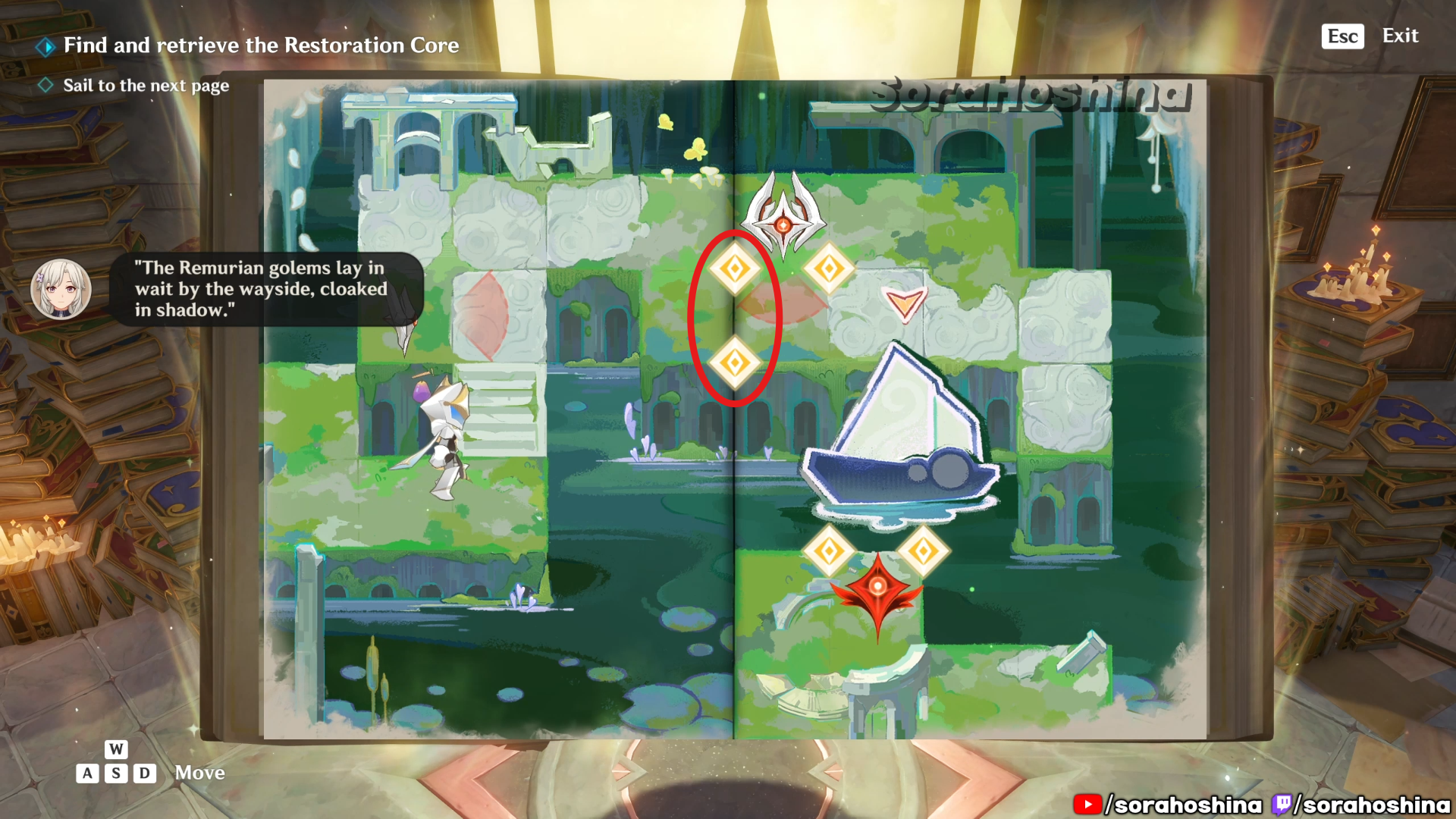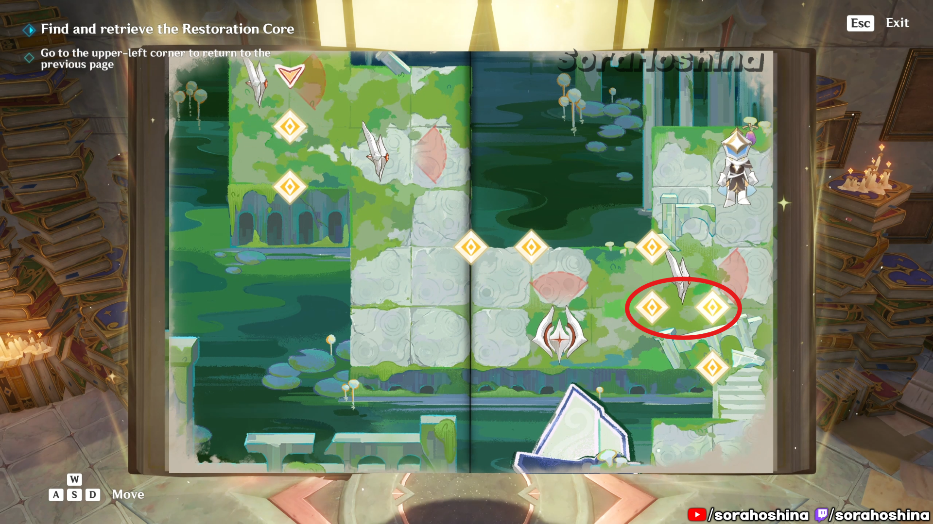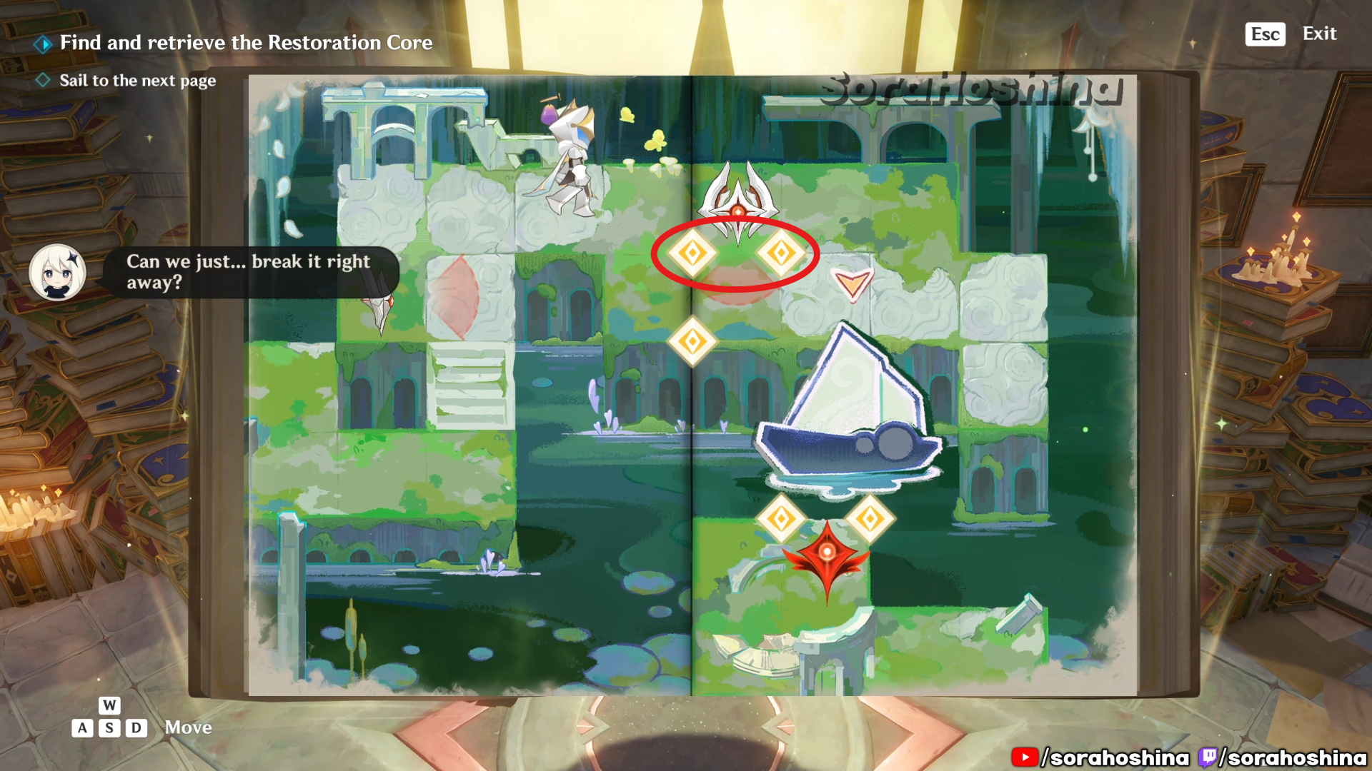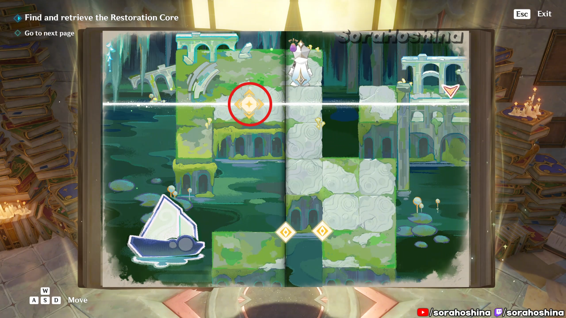 Inside the room with Fontain’s mechanism, flip the page in this room from right side only halfway to the left so you can get said mechanism. Unfortunately, it’s a trap to get the Restoration Core.