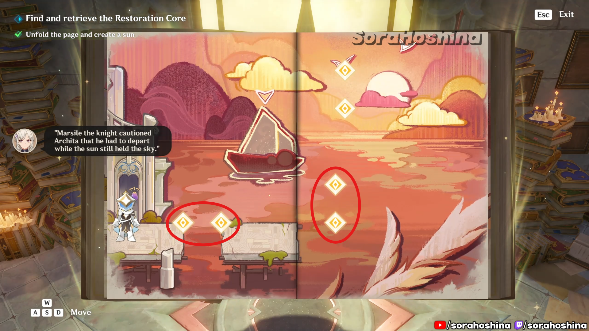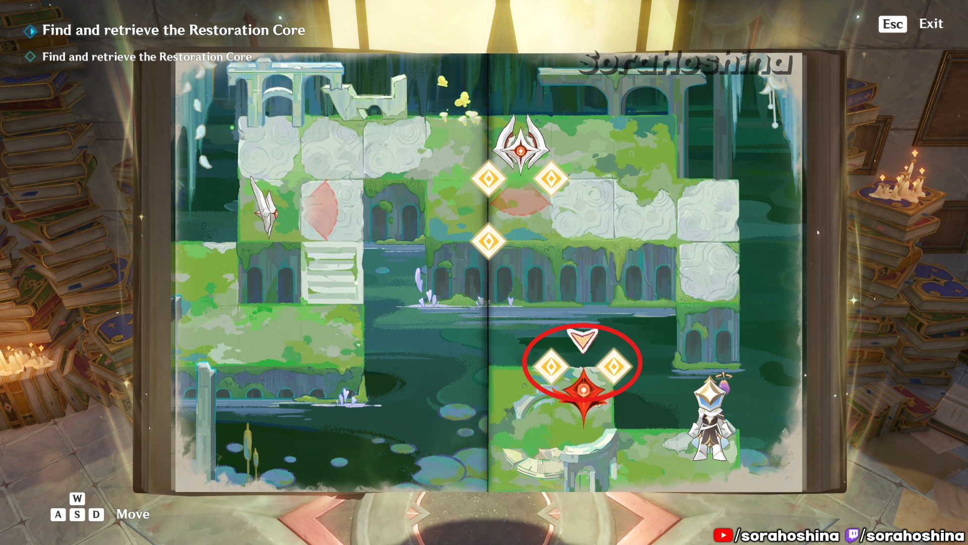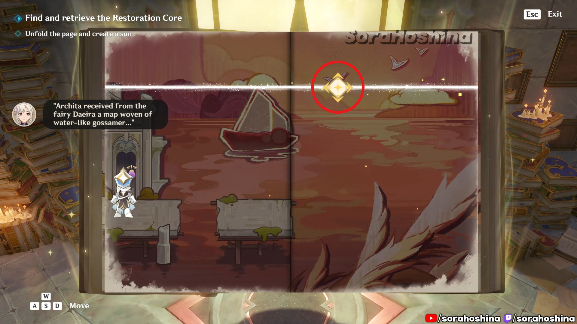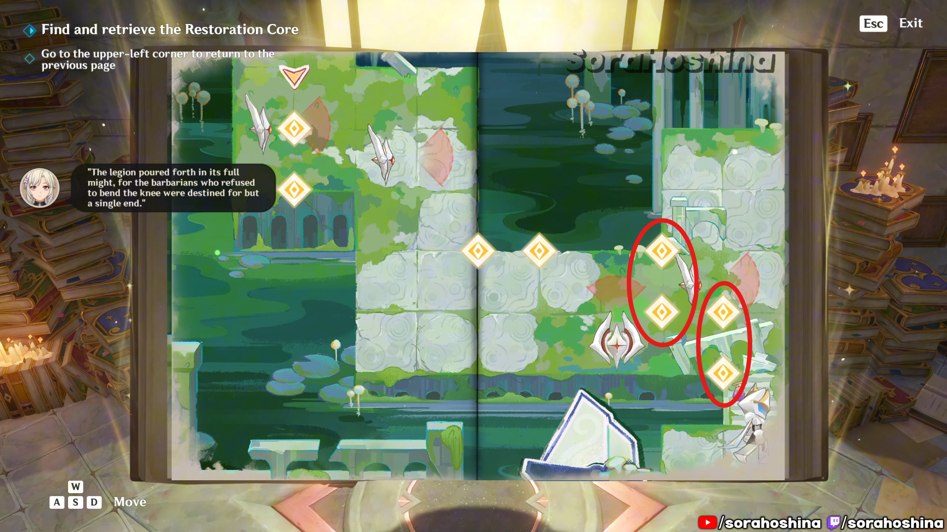Inside the room with Fontain’s mechanism, flip the page in this room from right side only halfway to the left so you can get said mechanism. Unfortunately, it’s a trap to get the Restoration Core.