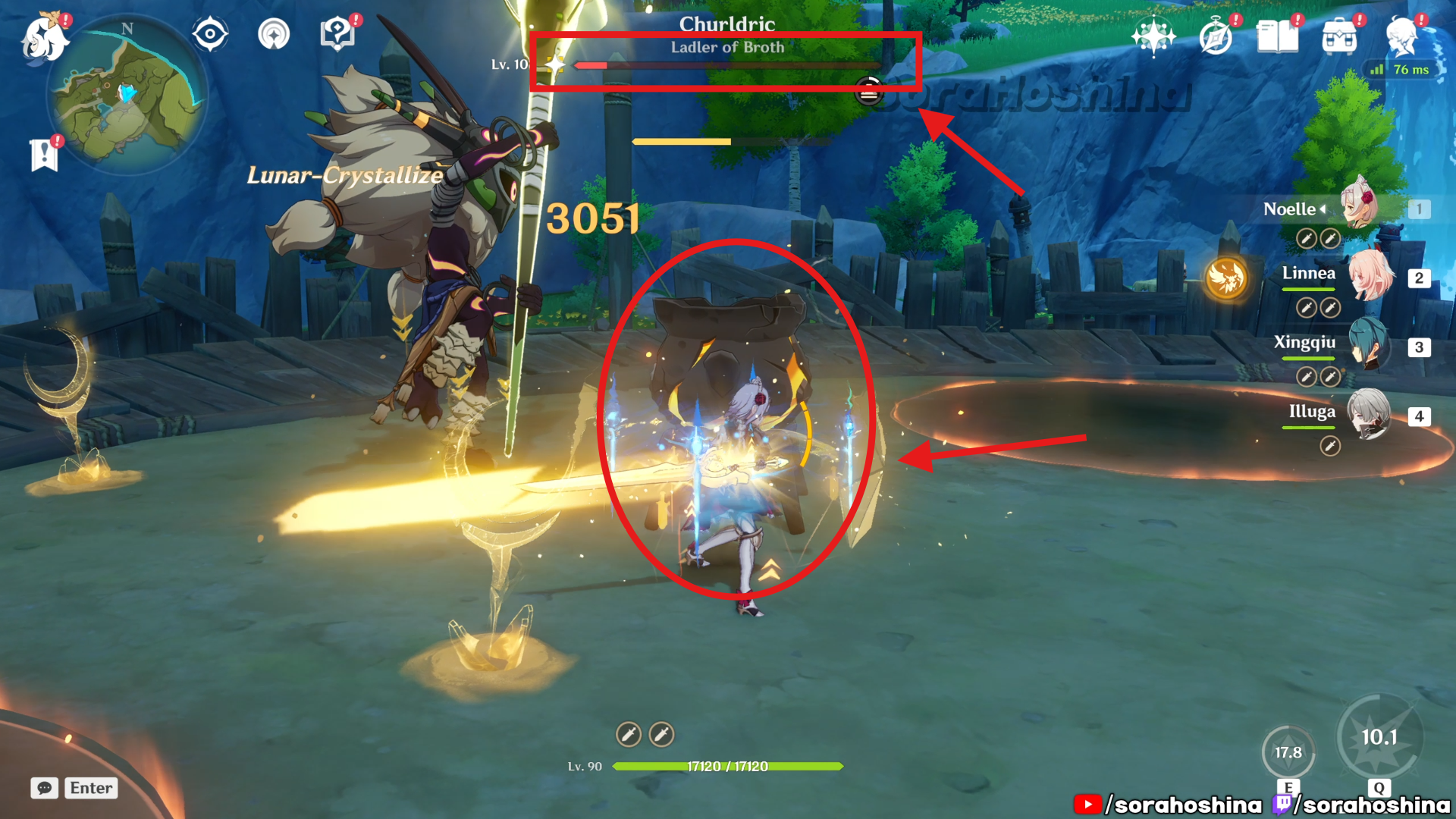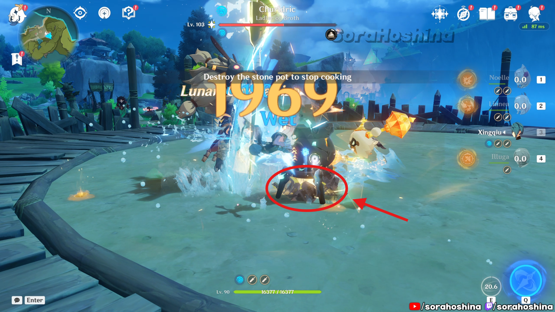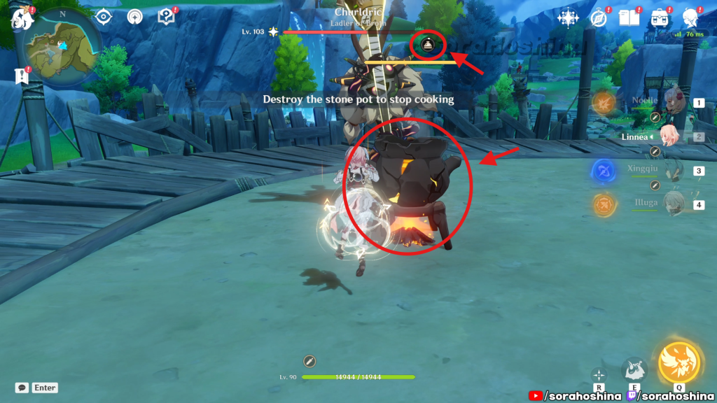 – Churldric summons a pot that has a Geo shield, and if you did not interrupt him within 10 seconds, it will complete the cooking inside the pot and will gain a buff. You can interrupt it by breaking the pot or put out the fire.