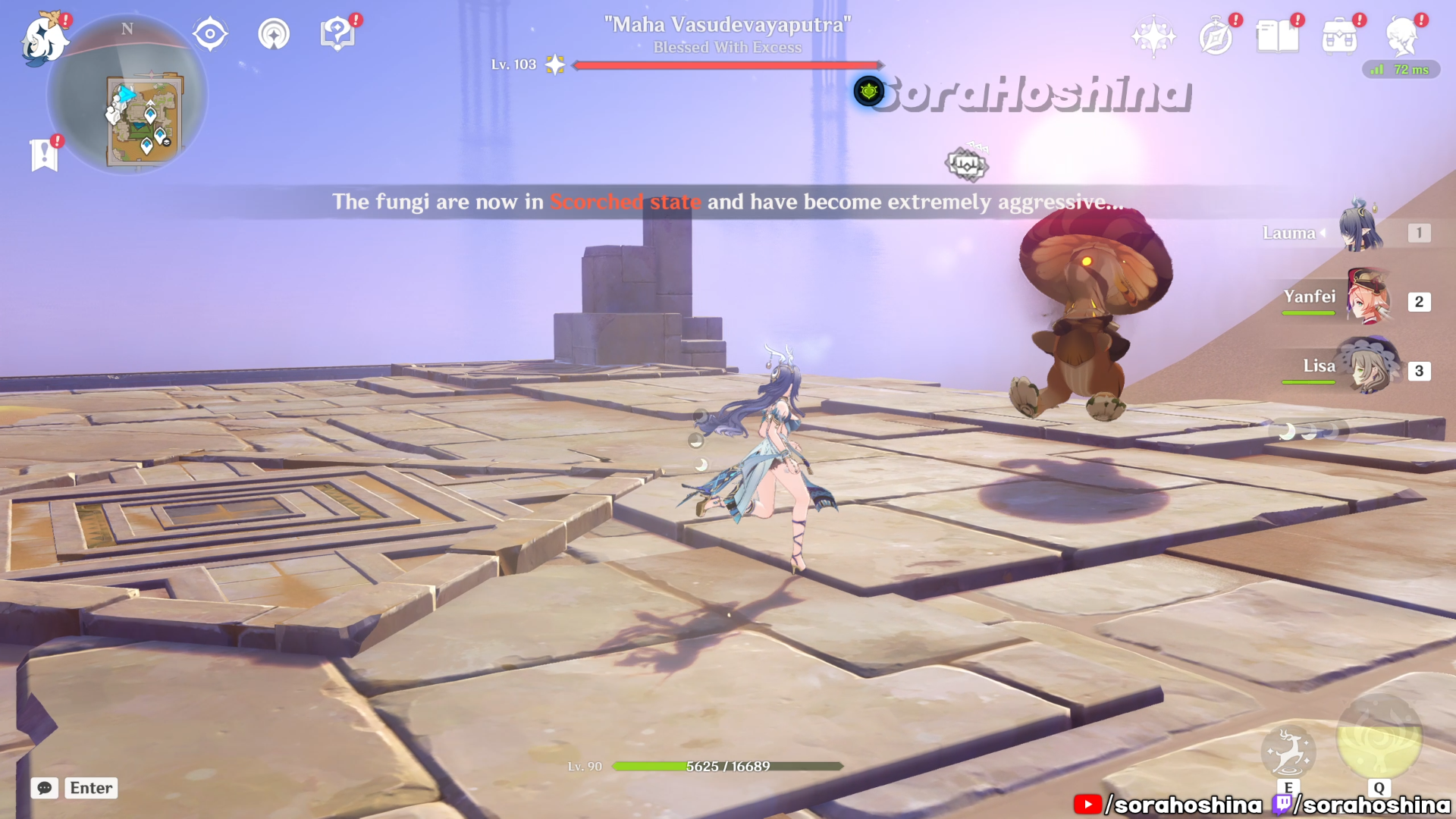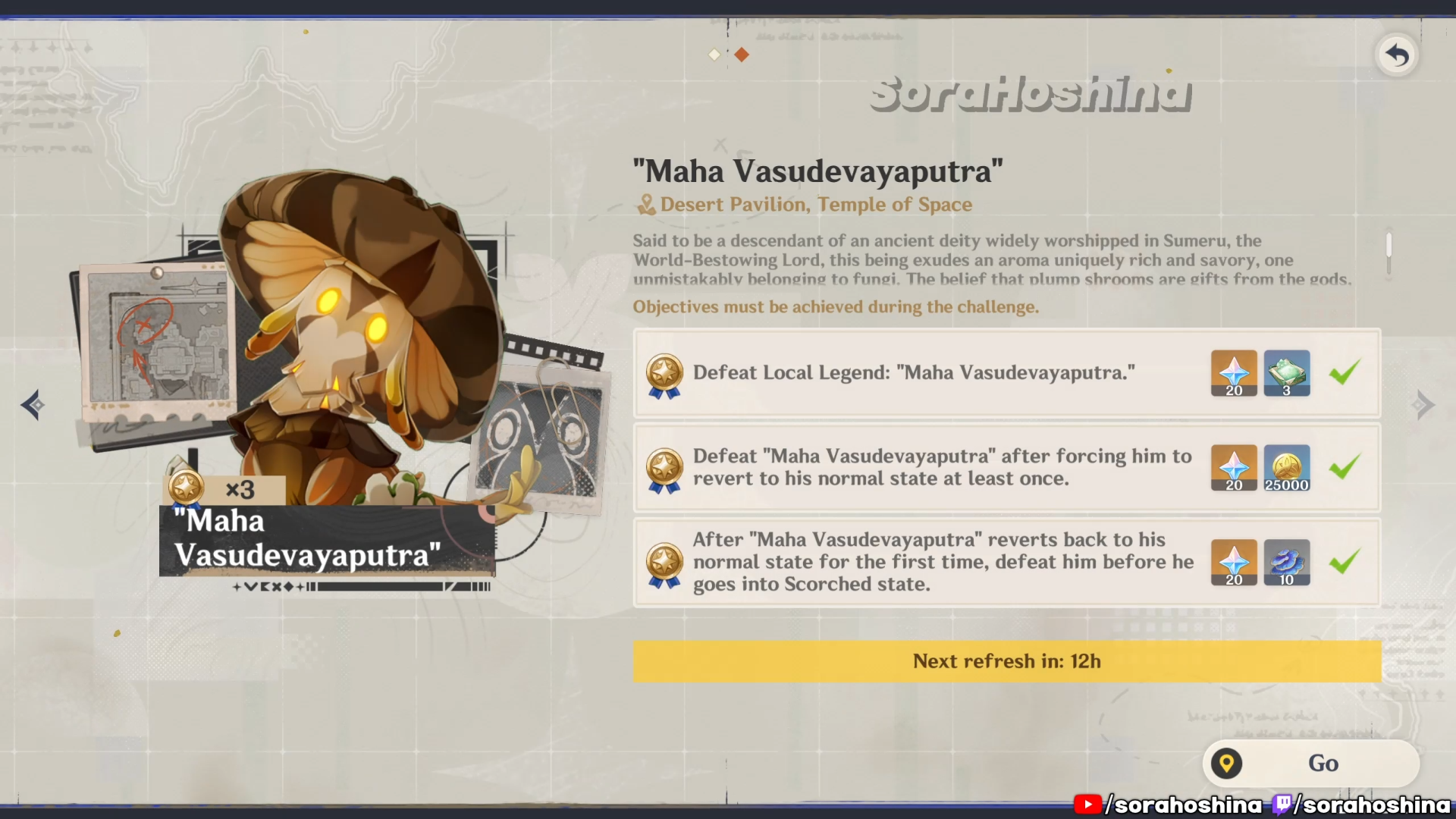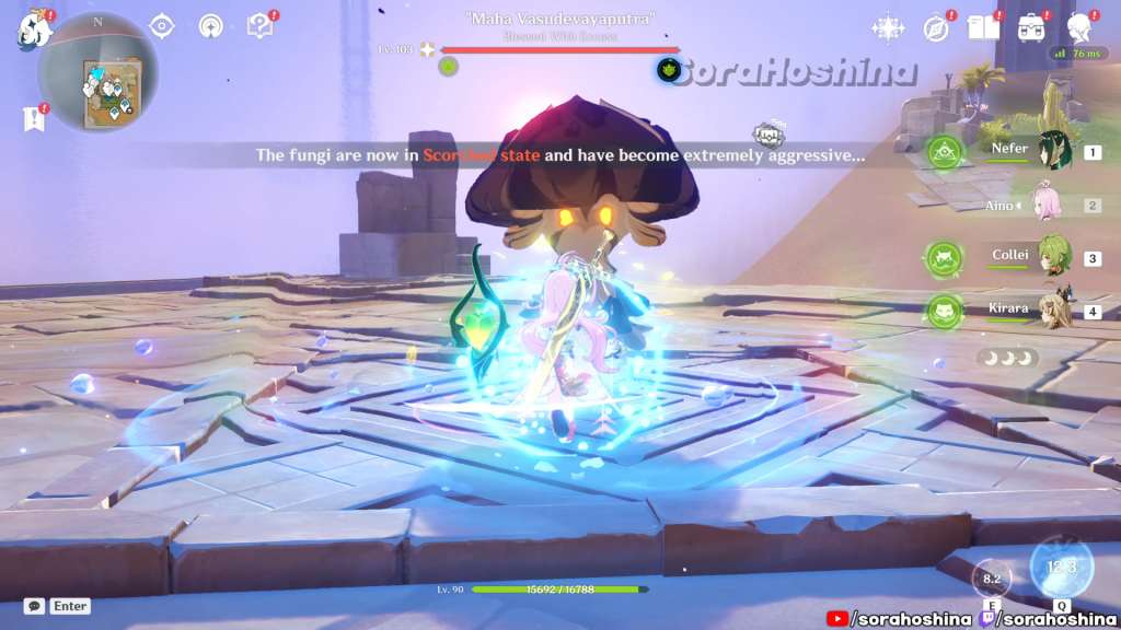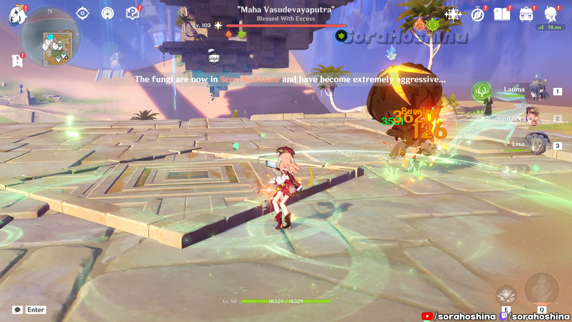 There are 2 states of “Maha Vasudevayavaputra”: Normal and Scorched. Once you enter the battle, “Maha Vasudevayavaputra” will immediately enters the Scorched state without you needing to use Pyro on them (like other normal fungi enemies). There will be a Dendro gauge bar under its HP bar.