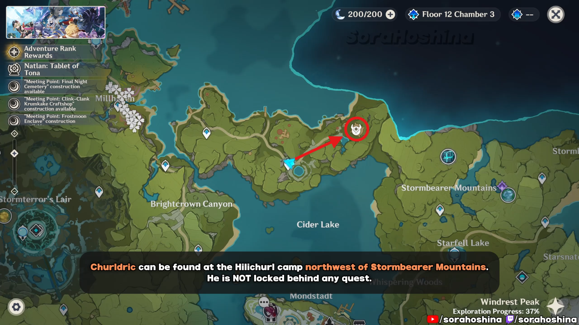 The first Local Legend is called Churldric, and you can find it northwest of Stormbearer Mountains. Teleport to Cider Lake north waypoint, and head northeast towards the huge Hilichurls camp. You can see a circle platform on the map, it’s the same one just like at the north of Dadaupa Gorge. Once you get near the platform, you can immediately start the battle against Churldric, he is not locked behind any quest.