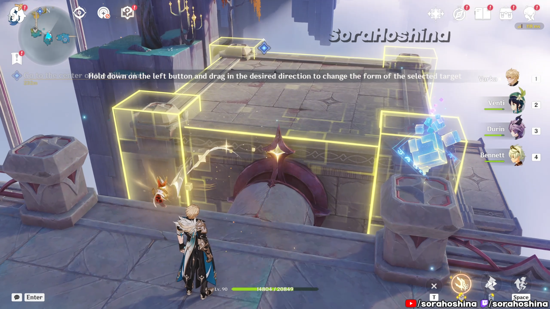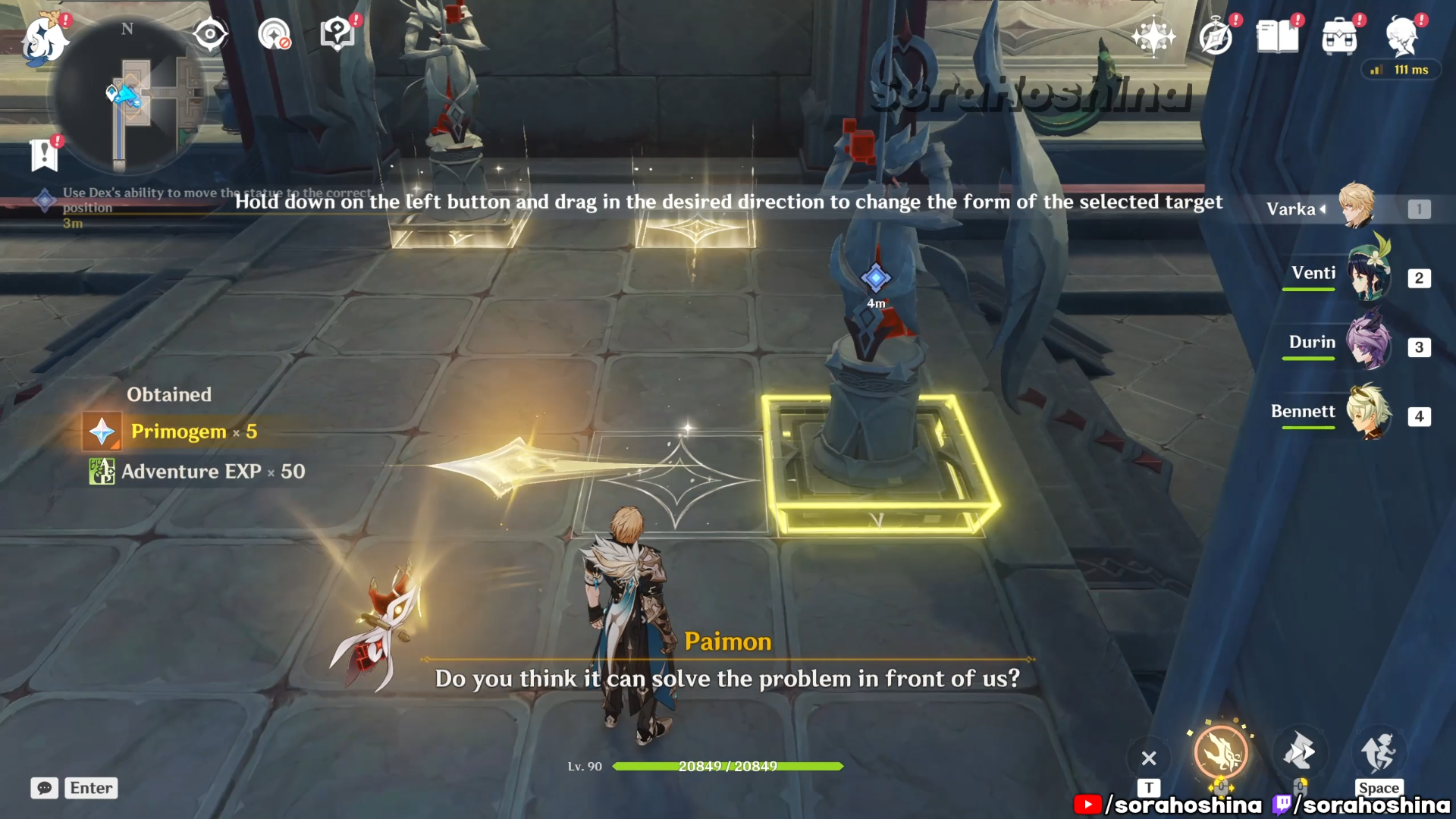 In the Temple of Space, your first puzzle is here and it’s in the form of a new mechanism called Dex: Spatial Dragging. Interact with the statue, and move it to the glowing platform before you can unlock the hidden door (Press T, hold the left-click button and move the camera in the direction it needs to do until you see the glowing arrow on the ground has finished charging, then release the T button so the statue will move by itself).