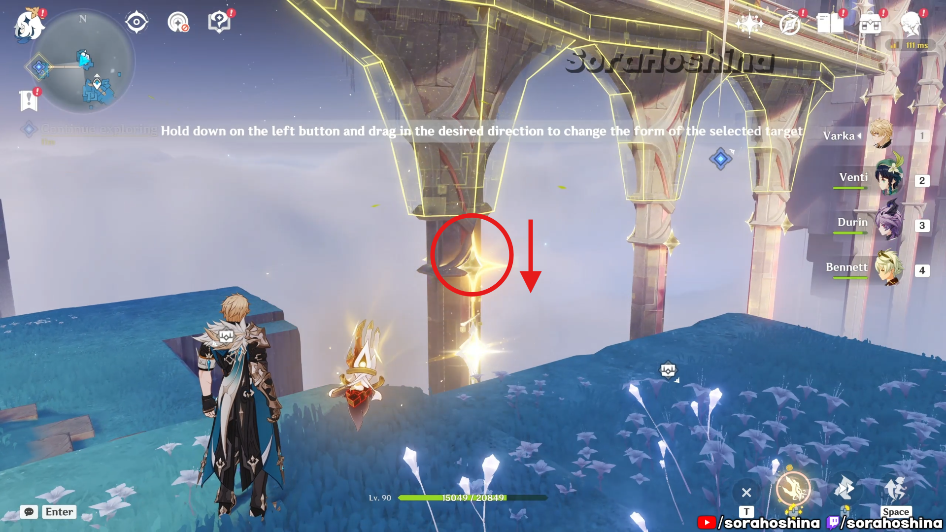 After saving yet another NPC, you need to reach the Pillar Hall Central Zone. To do that, you need to lower the bridges using Dex: Spatial Dragging. Go to the top of the platform, look at the central pillar, and drag your camera downwards until the arrow is fully charged. Be careful as the bridge will only lower temporarily so jump on top of it as soon as it goes down.